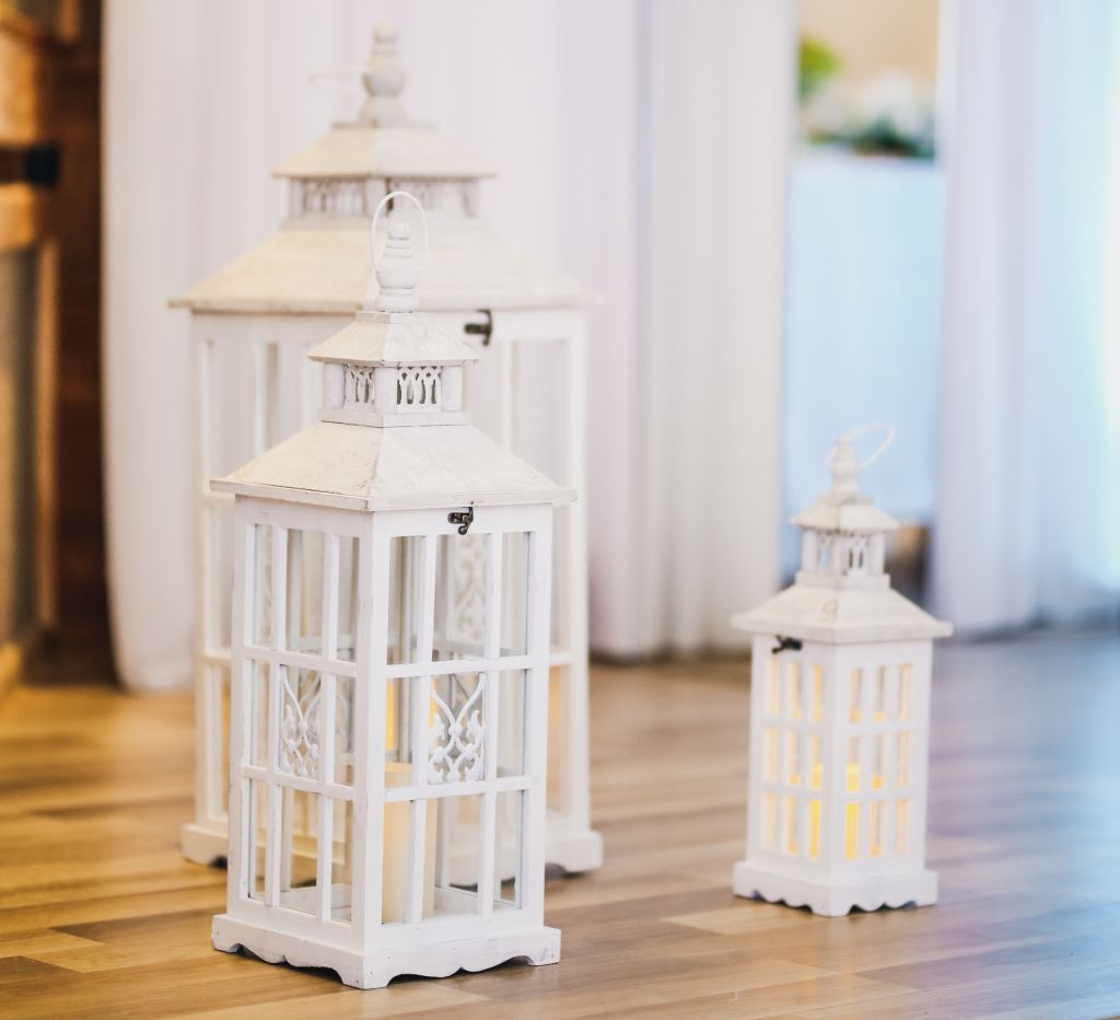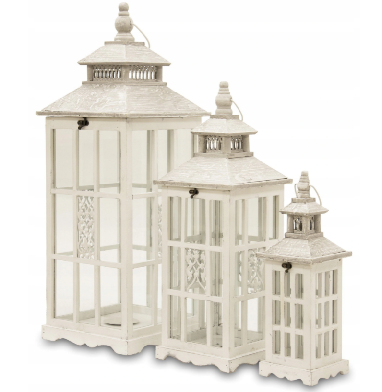 Wysokiej jakości lampiony drewniane w kolorze białym z szklanymi szybkami.